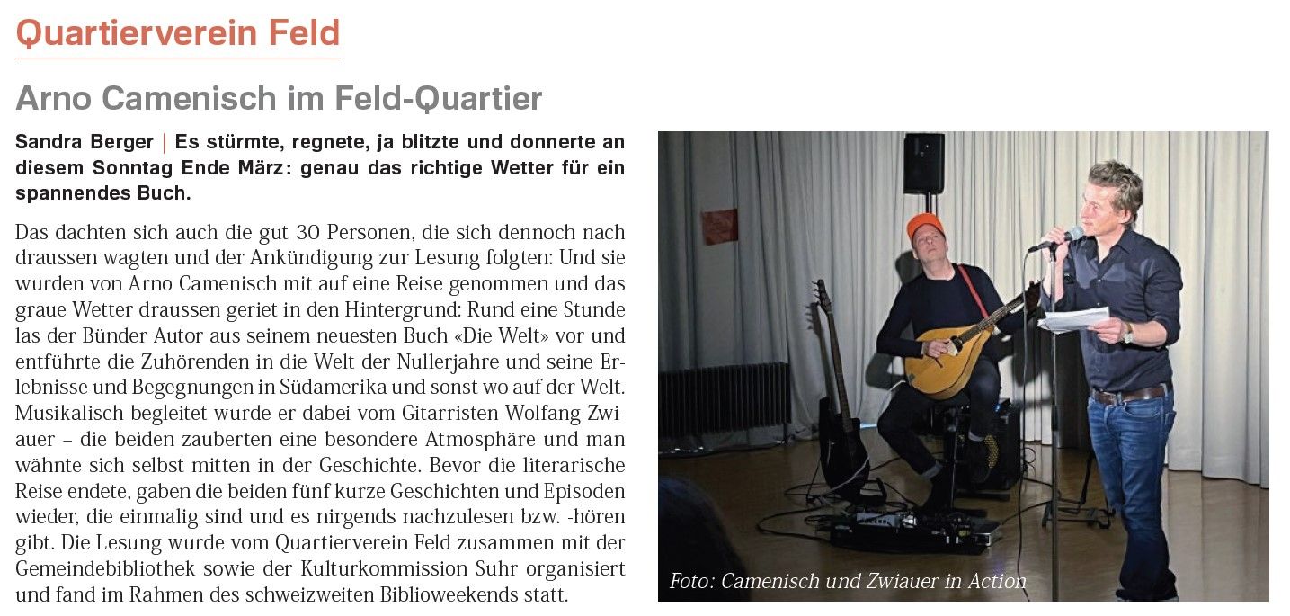 Das dachten sich auch die gut 30 Personen, die sich dennoch nach draussen wagten und der Ankündigung zur Lesung folgten: Und sie wurden von Arno Camenisch mit auf eine Reise genommen und das graue Wetter draussen geriet in den Hintergrund: Rund eine Stunde las der Bünder Autor aus seinem neuesten Buch «Die Welt» vor und entführte die Zuhörenden in die Welt der Nullerjahre und seine Erlebnisse und Begegnungen in Südamerika und sonst wo auf der Welt.