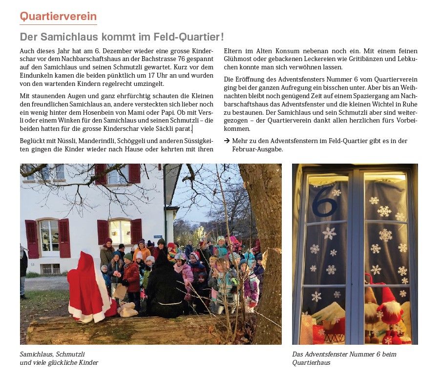 Auch dieses Jahr hat am 6. Dezember wieder eine grosse Kinderschar vor dem Nachbarschaftshaus an der Bachstrasse 76 gespannt auf den Samichlaus und seinen Schmutzli gewartet. Kurz vor dem